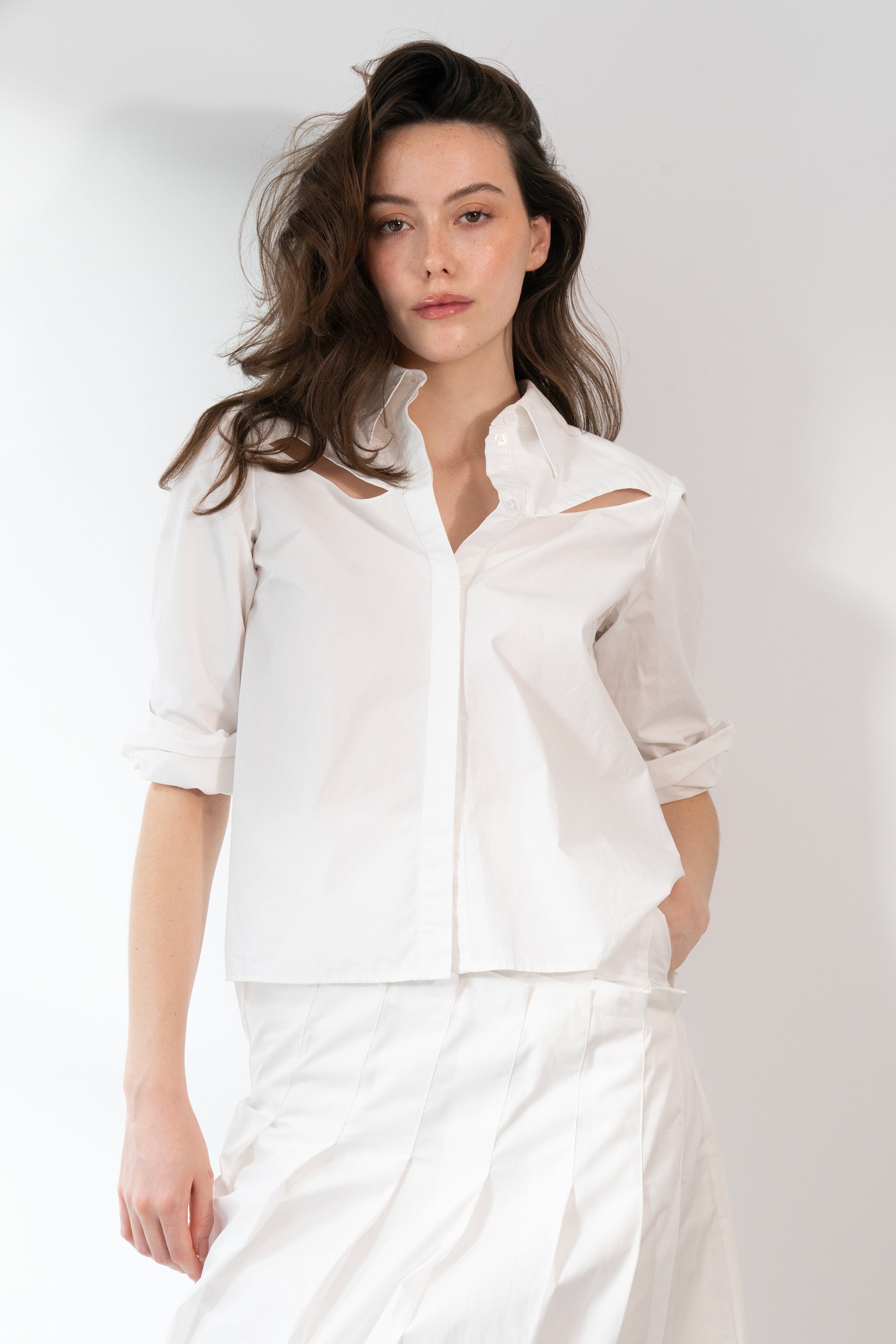 This white shirt embodies a minimalist aesthetic with an edge, making it a versatile essential for the modern luxury wardrobe.