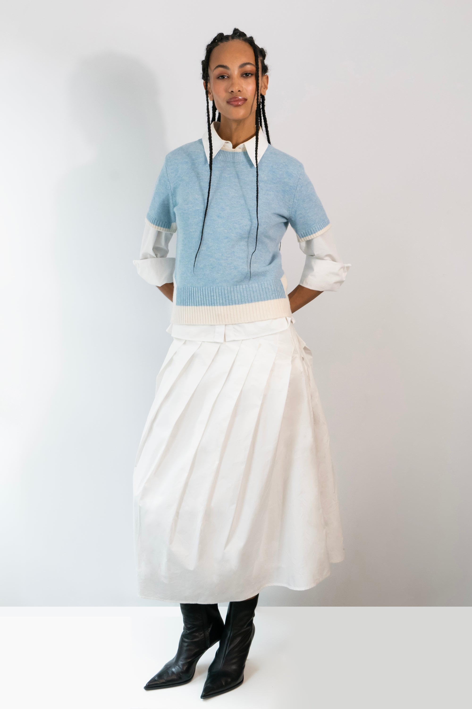 This skirt is crafted from high quality cotton shirting, featuring specialty diagonal pleating and pockets at the side seam.