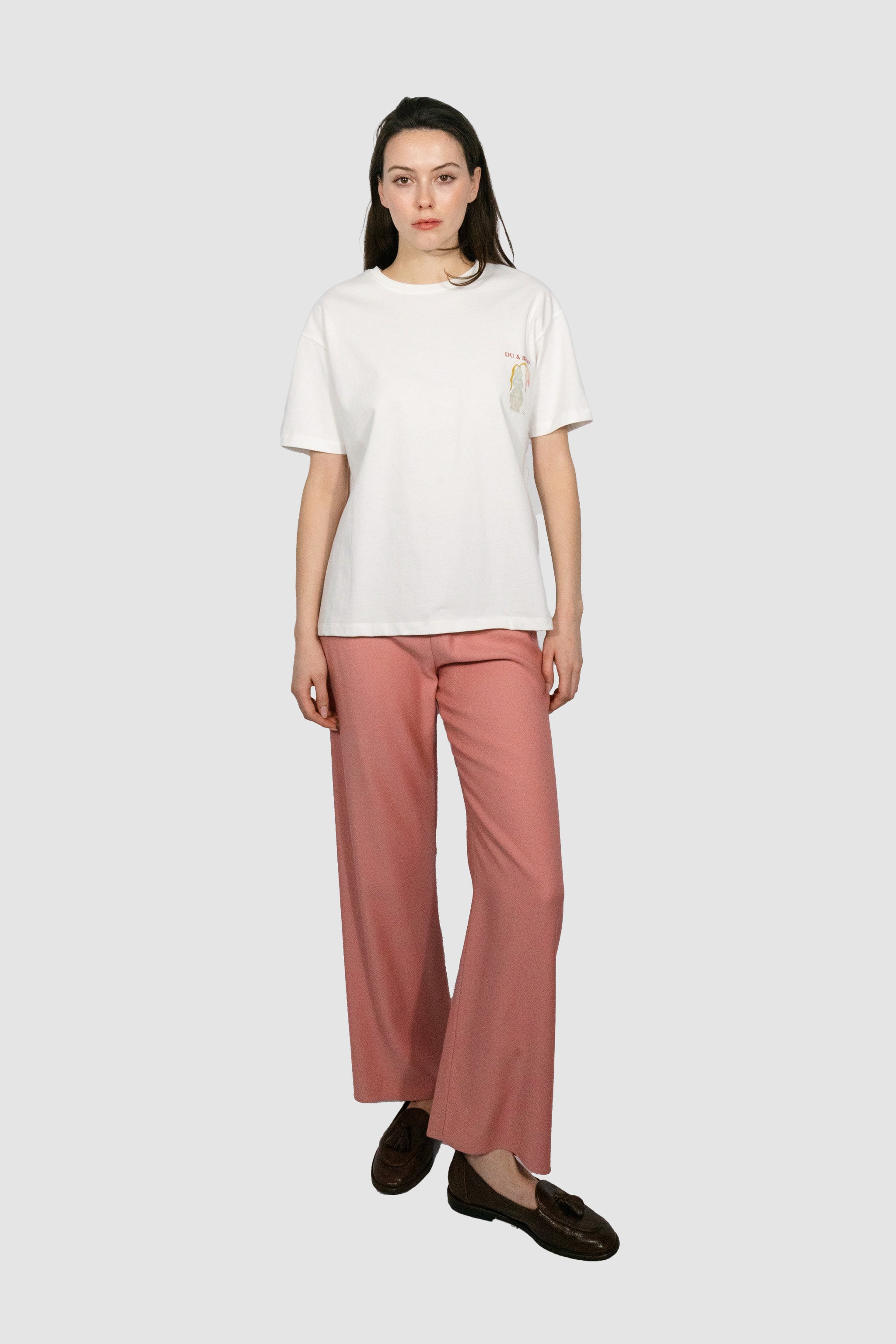 • Du & Berry dusty rose straight pants worn by a woman standing outdoors with a white halter top