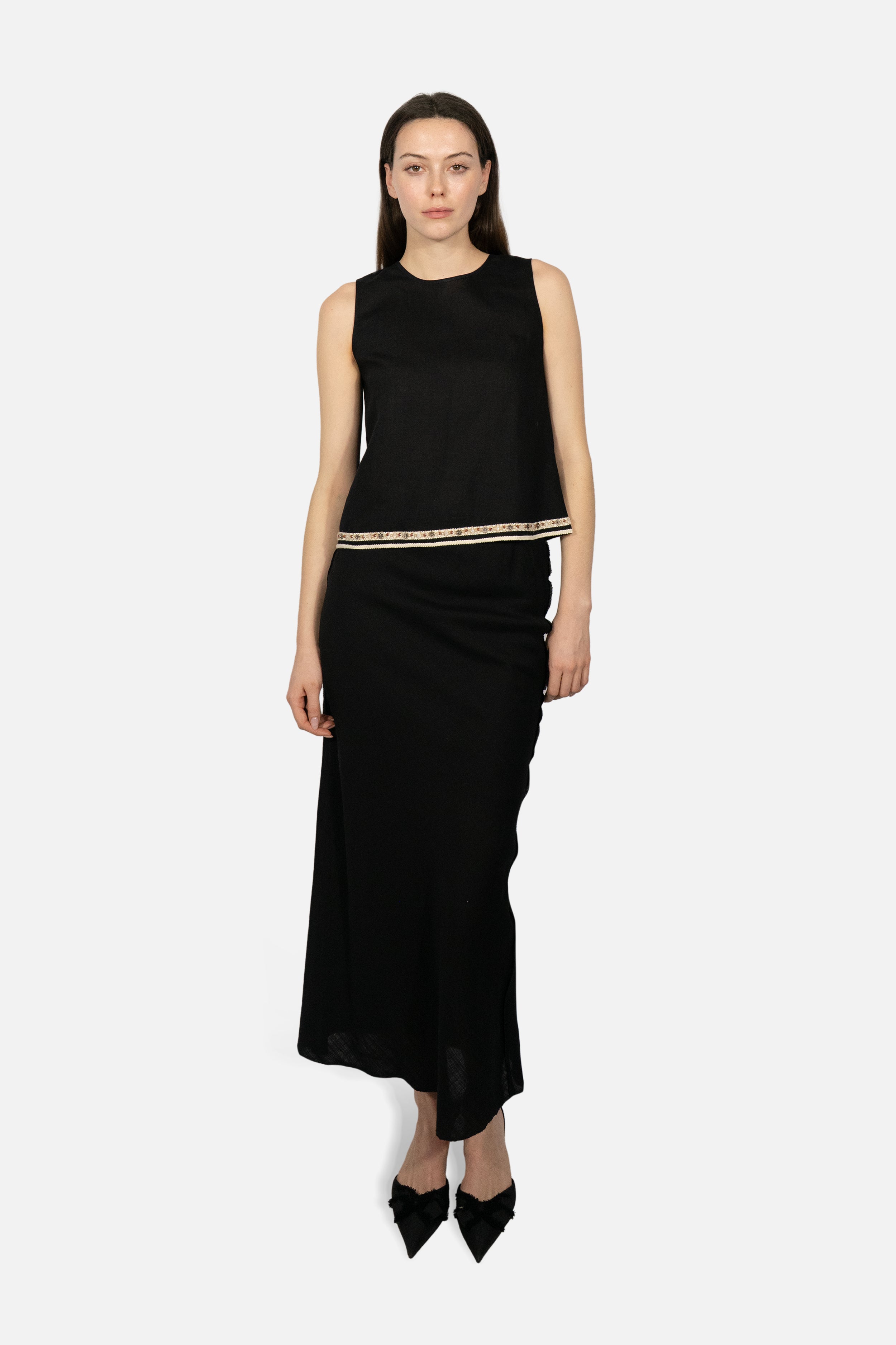 The Boho Linen Top & Skirt Set offers elegant ease in breathable black linen. The sleeveless top features delicate hand-beaded detailing at the hem, paired with a flowing 100% linen midi skirt, fully lined in soft cotton for comfort.