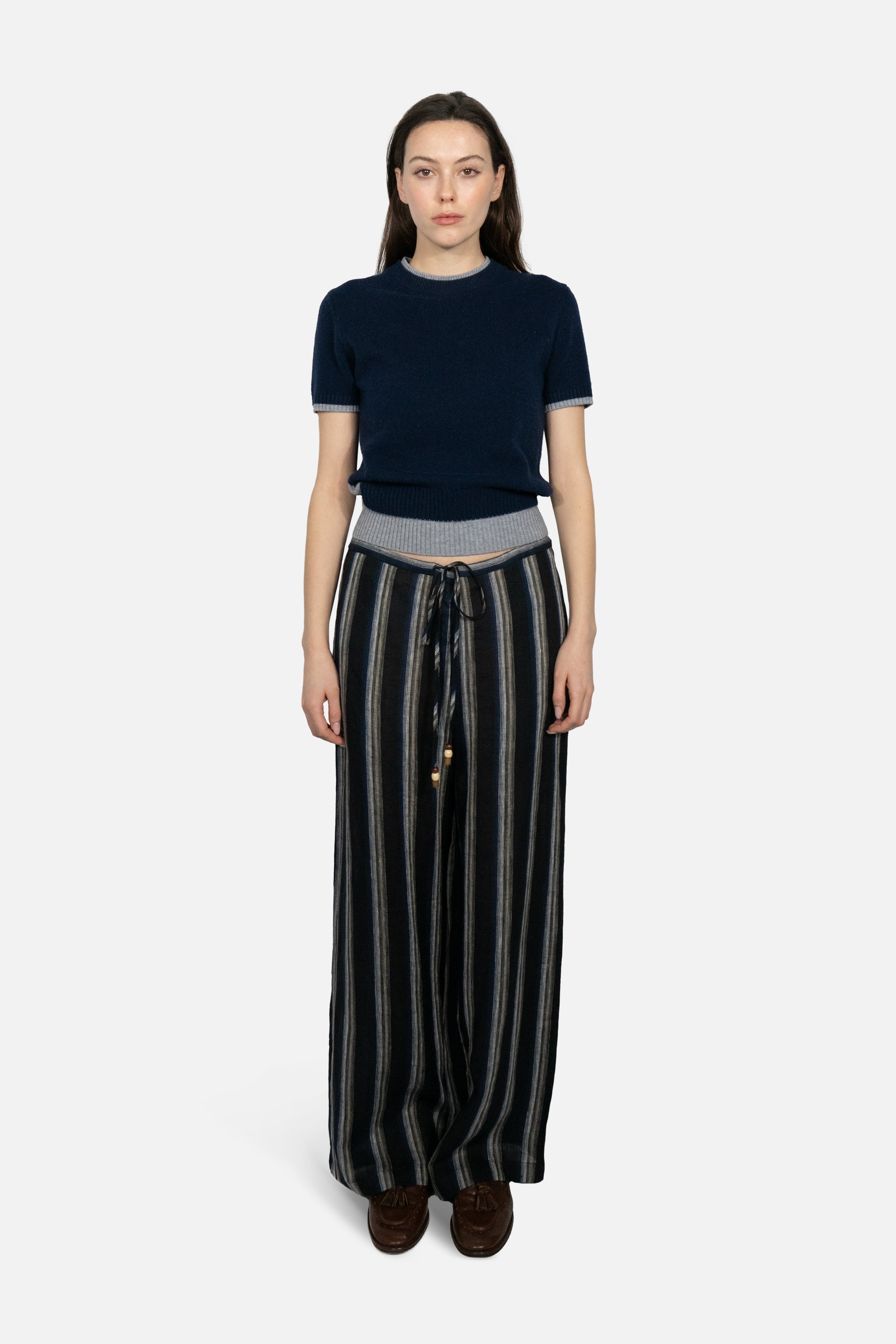 The Erin Linen Wide Leg Stripe Pants are cut from breathable 100% Linen Mélange with a flattering high-rise tie waist and wide-leg silhouette. Vertical stripes elongate the frame, while side-seam pockets offer quiet utility. The mélange weave blends crisp texture with tonal depth, creating a softly structured fabric with versatile wearability.