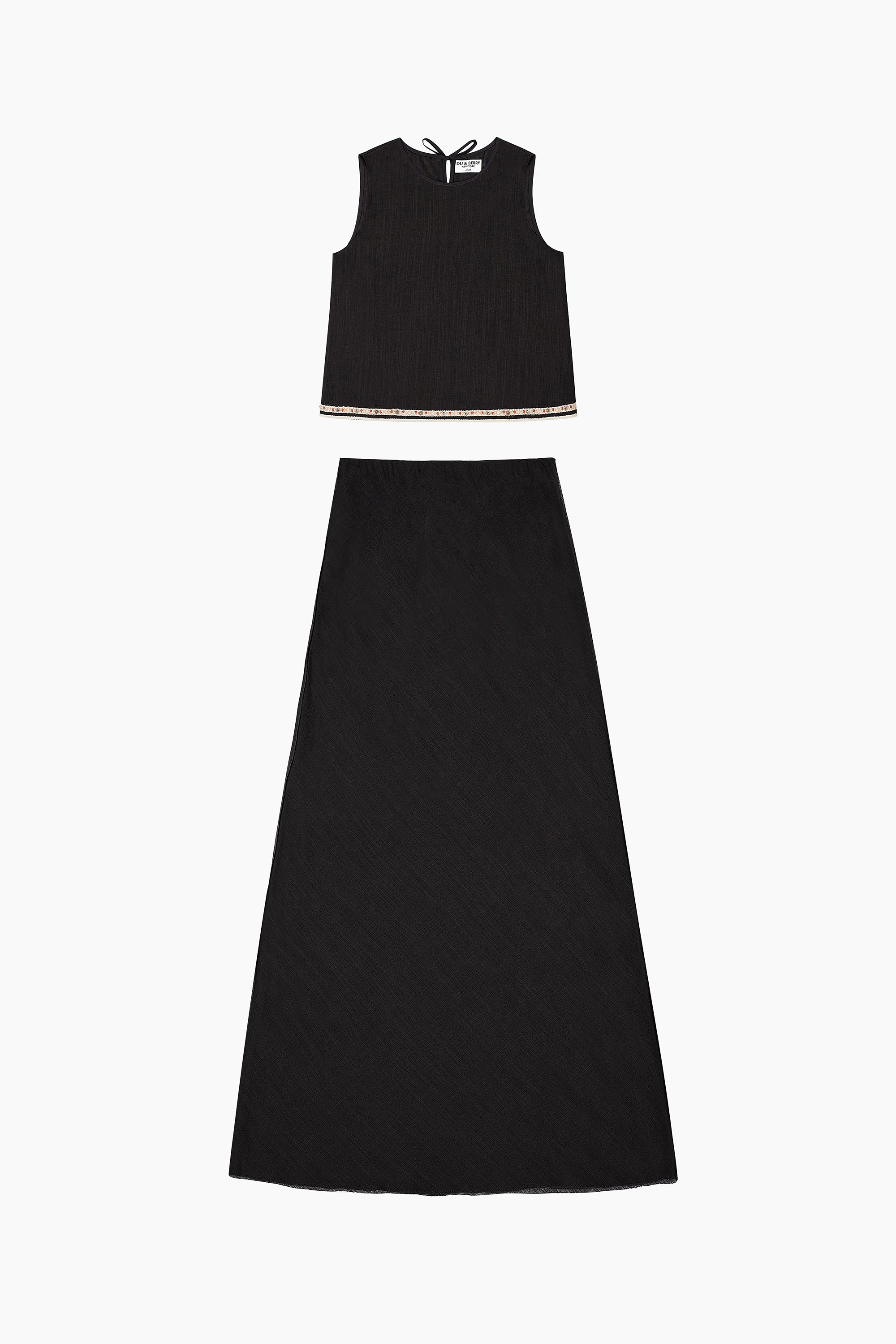 The Boho Linen Top & Skirt Set offers elegant ease in breathable black linen. The sleeveless top features delicate hand-beaded detailing at the hem, paired with a flowing 100% linen midi skirt, fully lined in soft cotton for comfort.