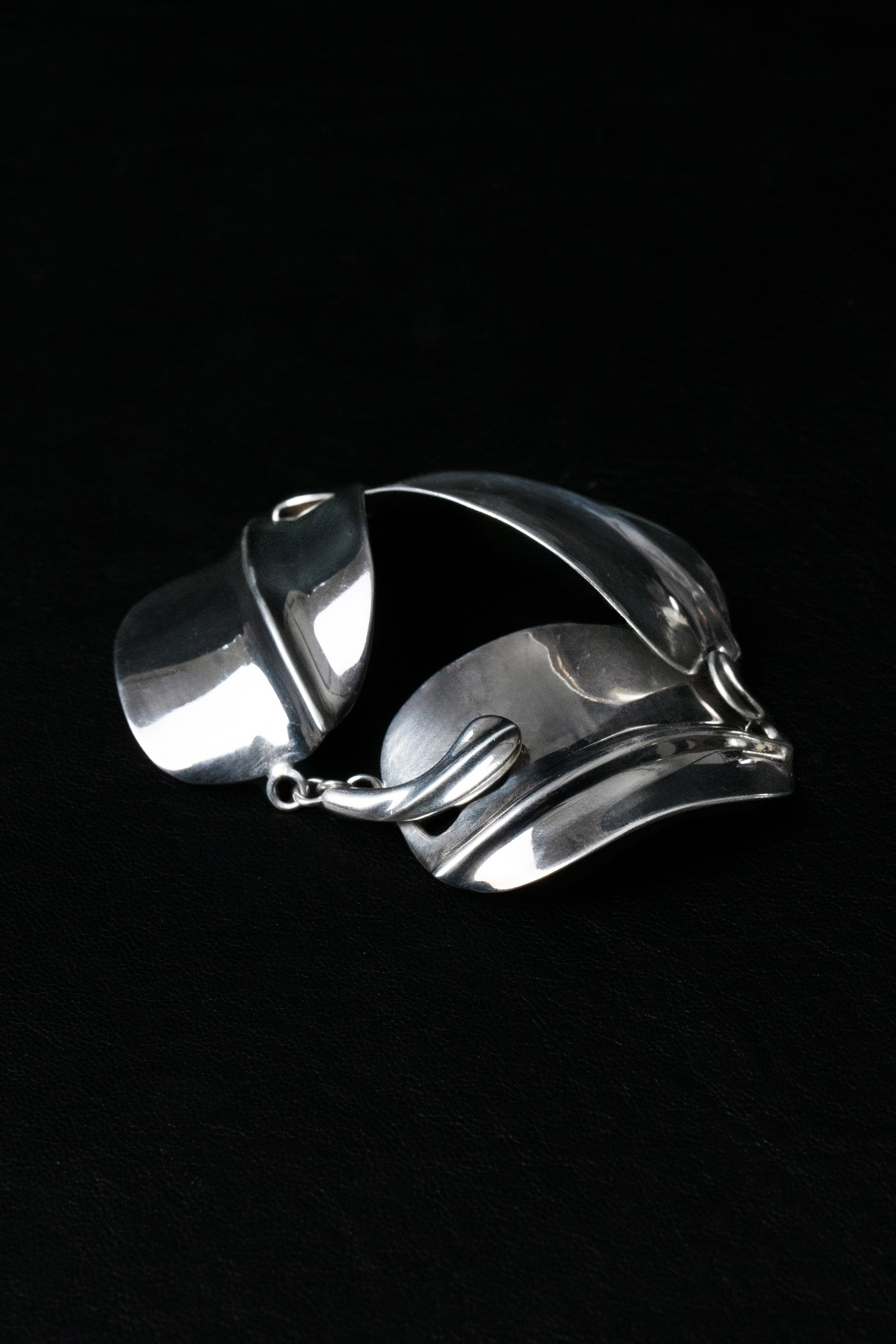 Sterling silver bracelet composed of curved, high-polish links joined in a fluid sequence.