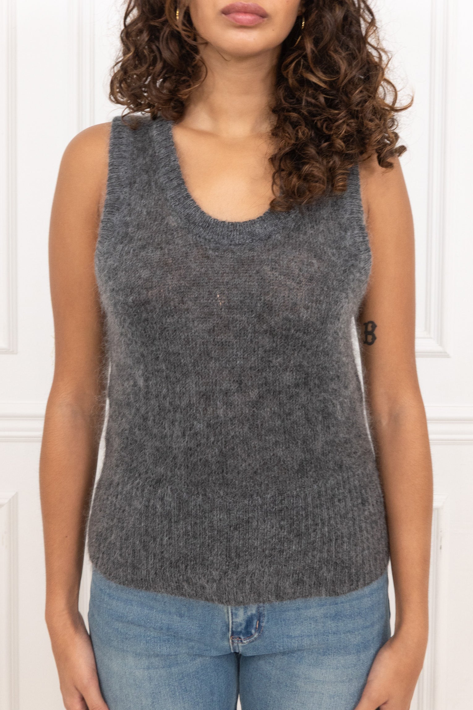Crafted from a soft mohair blend, this lightweight knit vest is designed for breathable comfort and effortless layering. Featuring a relaxed silhouette, brushed texture, and wide ribbed trims, it drapes naturally over the body for an easy, elevated look.